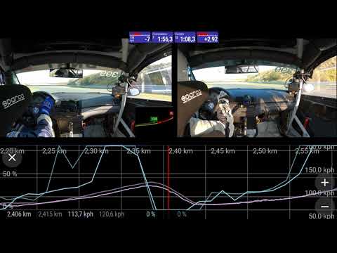 The onboard video source is a GoPro8, I hooked up a Garmin GLO for GPS (for the speed) and a BlueTooth OBDII reader for the throttle position. I used a screen recording software to grab the graphs of the phone. The laptime and delta is from the export function in RaceChrono. I then combined it all in Davinci Resolve.
